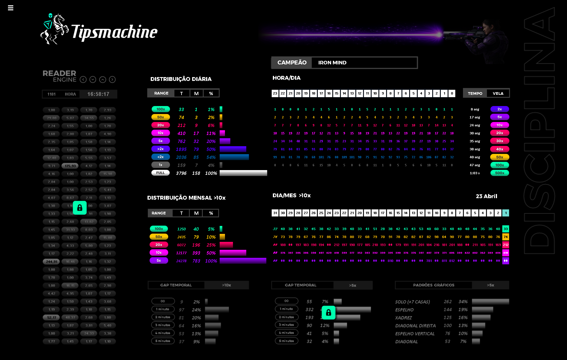 Ferramenta 100% gratuita que simula multiplicadores GREEN (WIN), baseada no comportamento do Aviator. Exibe o tempo das velas de 1x até 1.000x, permitindo treinar o olho e a mente na leitura e no aprendizado de padrões numéricos e temporais.