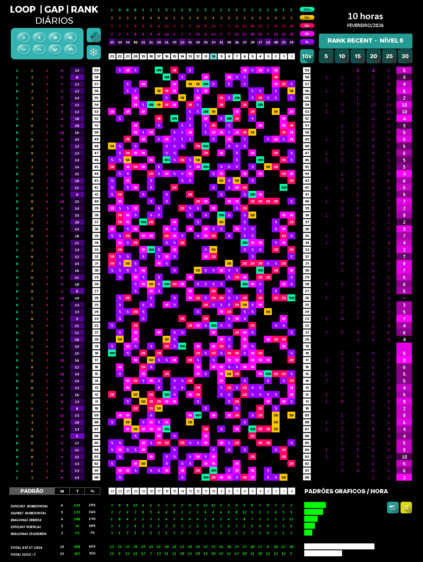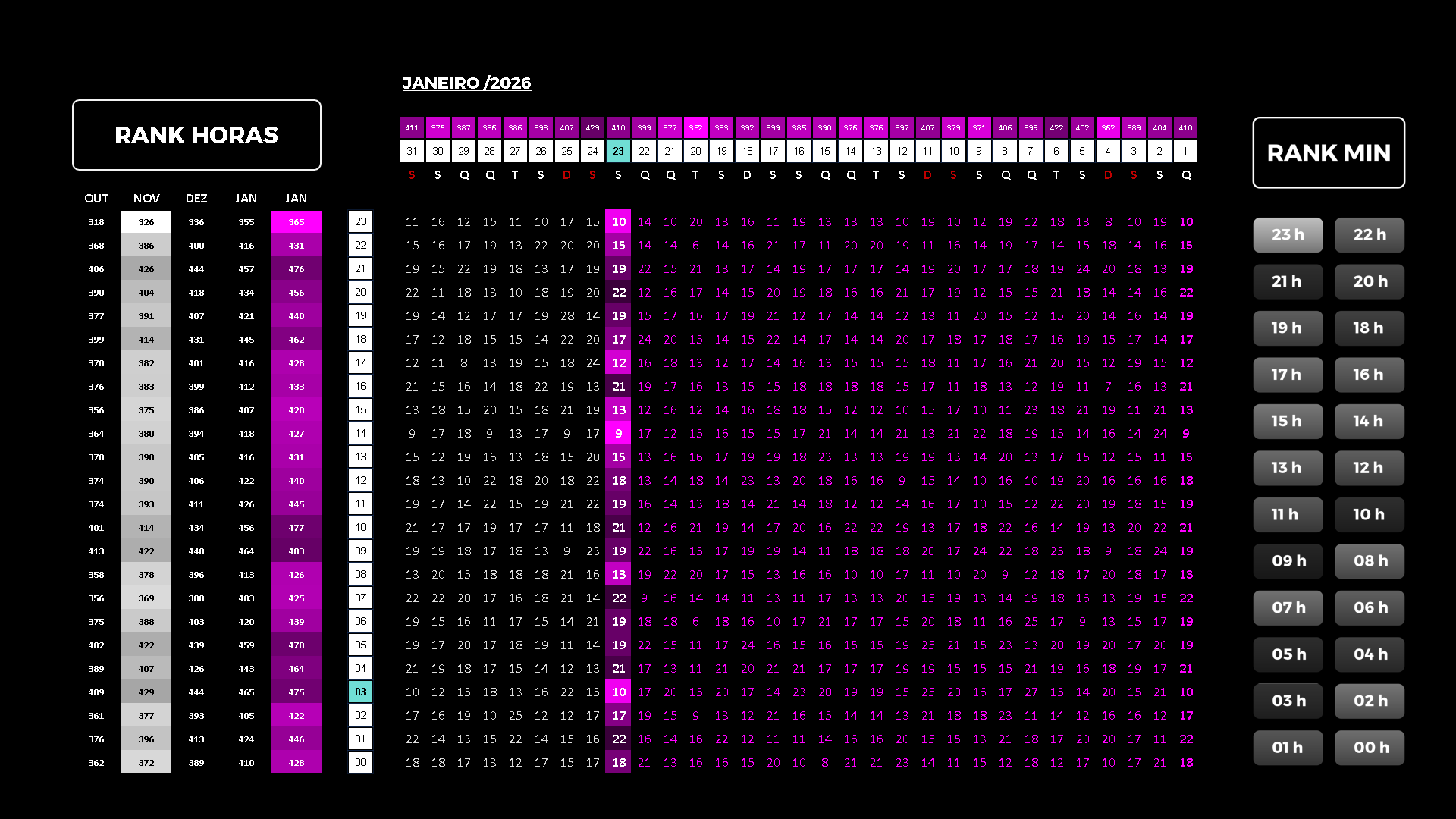 Possui o segunda DASHBOARD que você olha depois do Sistema Operacional. Porque aqui você visualiza e define: Quais dias da semana operar; Quais horários do dia operar; Quais minutos de cada horário operar; Possui heatmaps nas colunas (dias do mês) Possui heatmaps nas linhas (horas do dia) São 25 painéis onde 30 dias por mês, 24 horas por dia e 60 minutos de cada horário 46.848 células interagem com o sistema.