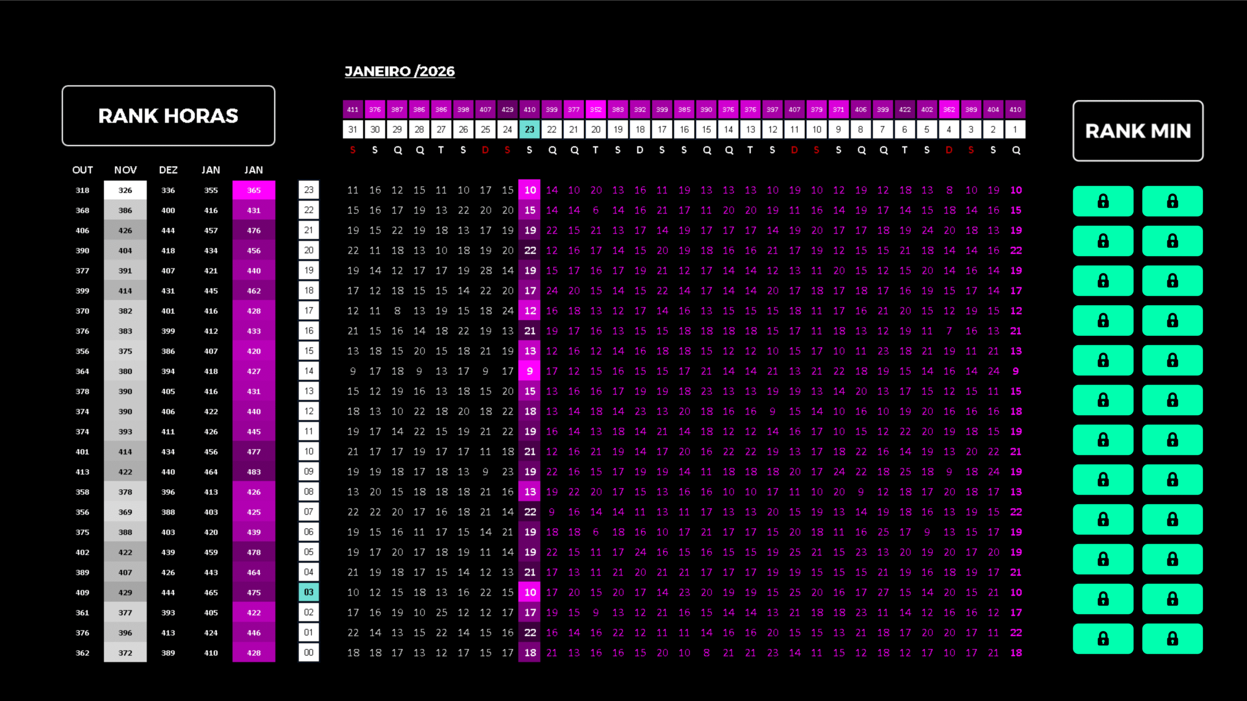 Seu corpo possui dois braços, o sistema sistema cíclico também os tem. Os Dois braços dos sistema cíclico são: RANK DE HORAS RANK DE MINUTOS Mas o que é rank? É o acumulo mensal de padrões de repetição, padrões temporais, no Sistema Temporal voce vai vêr esses padroes durante um dia, depois somem. Mas você não os perde porque aqui ficam armazenados diariamente.